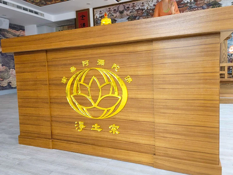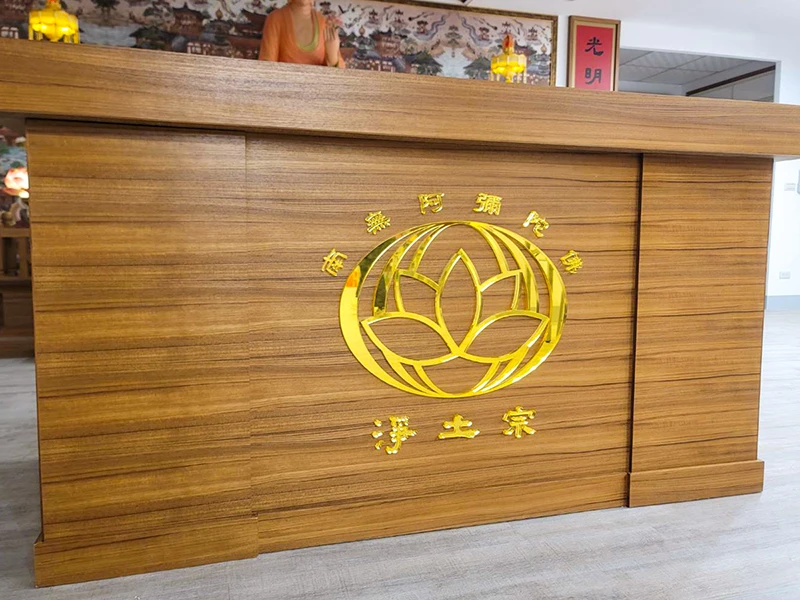 14 11 月 淨土宗宗徽 – 壓克力烤漆字 與金色水晶字 | 立體字應用 Posted at 15:34h in 立體字應用 by 人的生命 0 評論壓克力烤漆字 與 金色水晶字,同一個主題-淨土宗宗徽,同樣以木紋為底,以不同的立體字作法呈現。台南 淨土宗彌陀寺 知客室,櫃台前的立體字為呈現宗徽原本設計上的各元素顏色,採用壓克力烤漆字。除了正面,立體字的側面同樣烤上顏色。因為側邊也有烤漆,因此某些角度或是較小字體,在光線明暗對比不夠強烈時會有視覺上的模糊感,但整體性的觀看仍是具有識別度。淨土宗嘉義念佛會 講台前方水晶字則是以金色透明壓克力製作,不同於透明壓克力背面烤金色漆,整體的金色比較均勻、透亮。 更多 立體字應用Tags: 水晶字, 烤漆字, 立體字Share 列印頁面 0 Likes