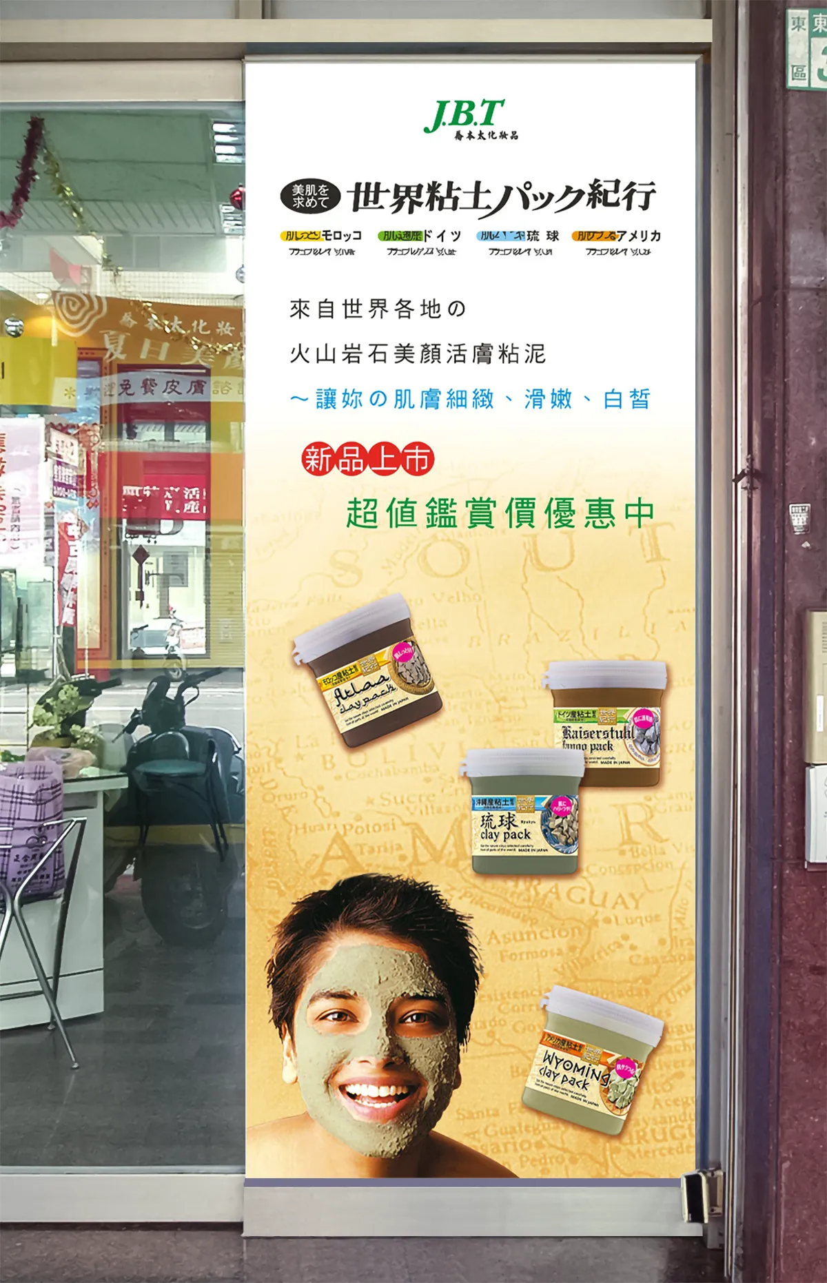 世界粘土 パック紀行~來自世界各地的火山岩石美顏活膚粘泥,讓追求美麗肌膚的你肌膚細緻、滑嫩、白皙。新品上市優惠活動海報、燈箱用於專櫃,海報則利用門市鋁門玻璃張貼大型噴圖PCV貼紙。海報背景鋪上土黃色古地圖呼應主標題"紀行",主標題與副標四個地點粘泥對肌膚的幫助 . . .