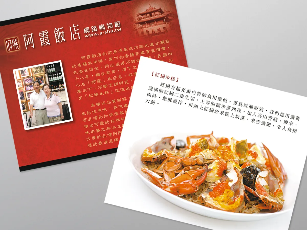 阿霞飯店 是台南老字號的手路菜餐廳,目前分為餐廳與網路購物二個經營團隊。 阿霞飯店 網路購物館以冷藏、冷凍宅配, 阿霞飯店 的招牌料理、彌月油飯、烏魚子,針對料理的保鮮、運送與再加熱食用,店家找尋合適的容器,再搭配最環保的包裝方式,彌月油飯僅於上蓋作一圓形貼紙(加熱時無須上蓋)